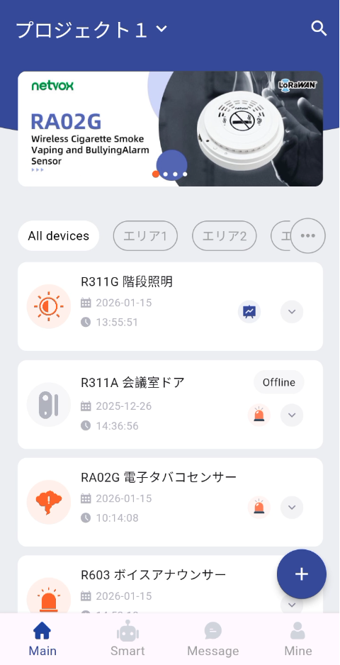 対応LoRaWANゲートウェイとアプリを接続することで、スマートフォンでのNetvox製品一括管理が可能です。