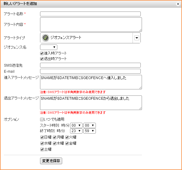 | アラート設定では、ジオフェンスへの入退出、設定速度の超過、レポートの無い時間、緊急時のSOS、バッテリー容量低下によるアラートなどをSMSまたはEメールで送信する設定が行えます。 |