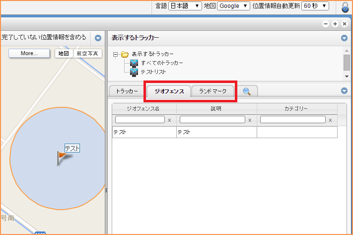 ジオフェンス、ランドマークの各タブを選択すると作成したジオフェンス、ランドマークを