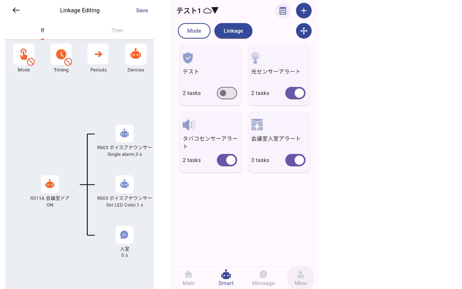 例:「R311A ドア/窓開閉センサー」でドアが開けられたことを検知するとスマホでアラート通知